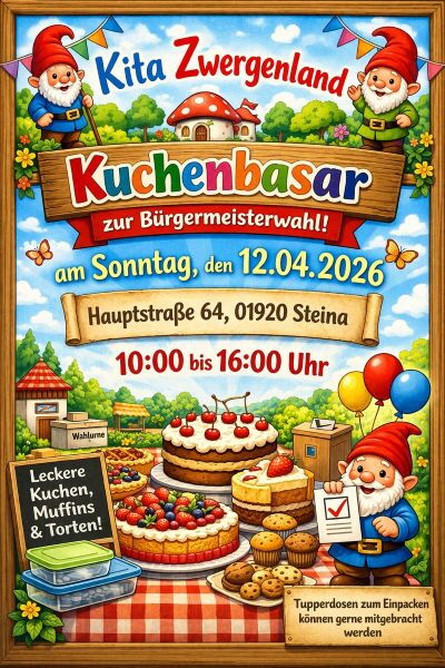 Am Sonntag, den 12.04.2026 veranstaltet die Kita "Zwergenland" zur Bürgermeisterwahl von 10.00 -16.00 Uhr im Vereinshaus einen Kuchenbasar.